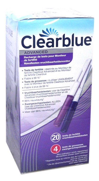 Les produits CLEARBLUE sont spécialisés dans les tests de grossesses, d’ovulation et de fertilité, et des moniteurs de contraception. Clairs et simples d’utilisation, leurs résultats sont efficaces. Les recharges s’adaptent au Moniteur de fertilité pour permettre d’établir les 3 jours qui sont favorables pour tomber enceinte ainsi que des tests de grossesse. La boite contient 20 tests de fertilité et 4 tests de grossesse.