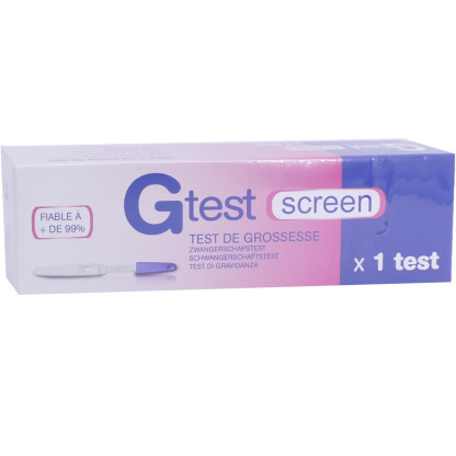 Depuis plus d’un siècle, Les laboratoires GILBERT développent un large choix de produits destiné à la santé et au bien-être de la famille, avec un souci constant d’innovation, de qualité, d’efficacité et de sécurité au meilleur prix pour tous. Le test de grossesse GTest Screen est très facile à utiliser, pratique et fiable à plus de 99%. Utilisable dès le premier jour de retard des règles, il permet de détecter la présence d’HCG (hormone gonadotrophine chorionique humaine) au seuil de 25 UI/L et 2 bandes mauves dans la fenêtre de lecture confirmeront une grossesse en seulement 3 minutes. Test urinaire à usage unique destiné à l’autodiagnostic.