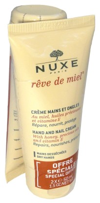Nuxe, contraction de Nature et Luxe, développe depuis 25 ans des soins cosmétiques raffinés, élaborés avec des actifs végétaux précieux, sans huile minérale ni matière animale hormis les produits de la ruche, pour offrir des produits associant avec le plus bel équilibre : nature, performance et sensualité. La gamme Rêve de Miel propose des soins cocons pour nourrir, apaiser et réconforter les peaux les plus sensibles. La crème mains et ongles Rêve de Miel, à la texture soyeuse qui pénètre la peau sans sensation de gras, formulée avec 88% d’ingrédients d’origine naturelle dont des extraits de miel, de l’huile de tournesol et de la vitamine E, est spécialement conçue pour nourrir, réparer, et protéger les mains abîmées. La peau retrouve douceur et souplesse, les ongles sont fortifiés, les mains s’enveloppent d’un délicat parfum de miel. Sans paraben.