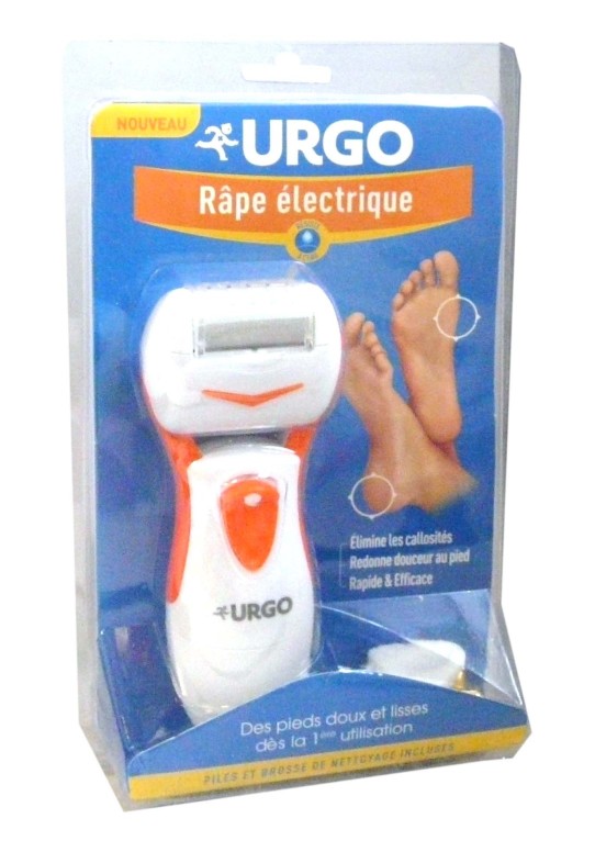 Le laboratoire URGO conçoit des produits pour le soin des mains, des pieds, des plaies cutanées et buccales, des vitamines... La râpe électrique d’URGO composée d’un rouleau exfoliant rotatif élimine les callosités, peaux épaisses et mortes de la peau sous les pieds. Elle agit par mouvements réguliers pour éliminer la totalité des callosités. Sa forme ergonomique permet une prise en main facile pour une utilisation sans difficulté et un passage sur toutes les zones du pied. Son rouleau peut être réutilisé et lavé, la râpe résiste à l’eau. En quelques minutes la peau morte est éliminée, les pieds sont lisses, et retrouvent toute leur douceur et leur souplesse. Fonctionne avec des piles incluses avec la râpe.