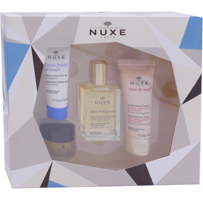 Le coffret NUXE « Les Indispensables » dans votre parapharmacie en ligne à prix discount, 4 produits hydratants et sublimateurs à offrir ou à se faire offrir pour des fragrances mythiques du parfum NUXE! Baume lèvres Rêve de Miel (15g) ; Huile Prodigieuse offerte (30ml) ; Crème mains et ongles Rêve de Miel (30ml) ; et Crème Fraîche de Beauté (15ml). Pour peaux normales même sensibles