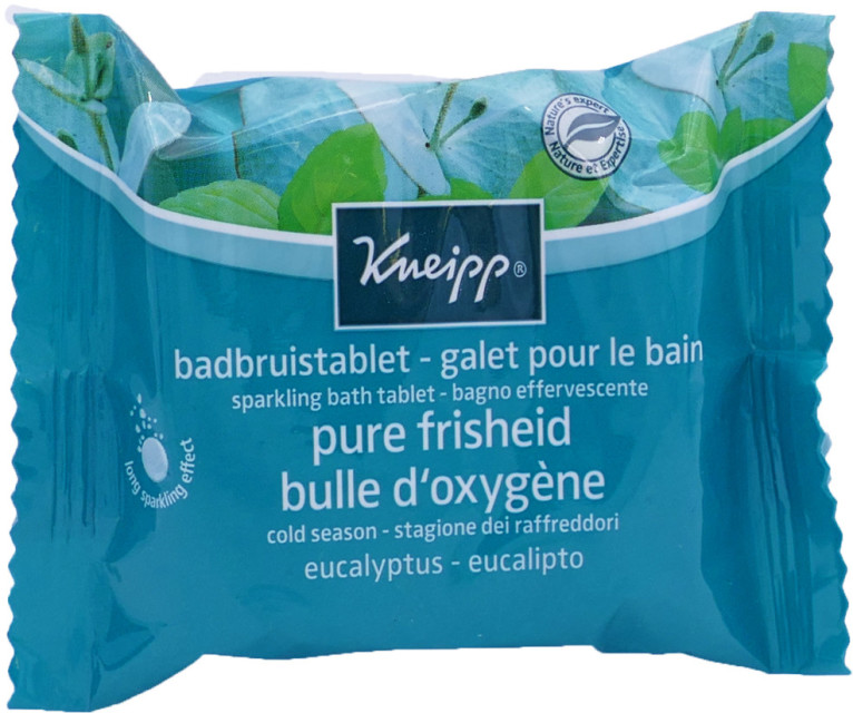 Depuis 1891, KNEIPP développe des produits destinés au bien-être et au maintien de la santé à travers une large gamme de soins corporels et produits pour le bain, composés exclusivement d’extraits de plantes et d’ingrédients d’origine naturelle. La philosophie de KNEIPP s’articule autour de l’art du bain et les galets de bain participe à cette philosophie. Ces galets effervescents libèrent progressivement dans l’eau chaude leurs huiles essentielles et leurs sels thermaux et offrent, grâce à leurs délicates bulles sur la peau, un massage extrêmement délassant. La formule de ces galets est exempte de conservateur et d’huile minérale, testée sous contrôle dermatologique et non testée sur les animaux. Chaque parfum procure un bienfait particulier : le galet Bulle d’Oxygène à l’eucalyptus est stimulant et décongestionnant sur la fatigue et les voies respiratoires.