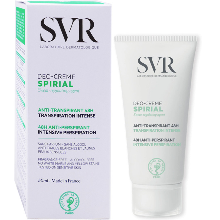 Plébiscitée depuis plus de 50 ans par les dermatologues, SVR propose des soins adaptés aux besoins, aux spécificités dermatologiques et au mode de vie des utilisateurs : anti-âge, problèmes pigmentaires, peaux grasses, peaux sèches, peaux intolérantes… Afin de proposer des solutions aux désagréments liés à la transpiration, SVR a conçu une gamme de soins alliant efficacité et haute tolérance : SPIRIAL. Le Déodorant Anti-transpirant Crème, à la formule haute tolérance anti-irritation, à la texture non collante qui laisse la peau douce et confortable, est conçu pour assurer une action sudo-régulatrice de 48h. Il régule la transpiration, absorbe l’humidité et lutte contre les odeurs désagréables grâce à sa composition à base de Microsphères absorbantes. Utilisation multi-zones : pieds, mains, aisselles, visages…Formule hypoallergénique testée sous contrôle dermatologique, sans parfum, sans alcool, sans paraben, non comédogène.