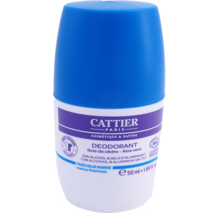 Le laboratoire CATTIER développe des produits pour le soin et le bien-être de toute la famille à base d’ingrédients naturels bio et d’argiles sans silicone, sans paraben, sans produits chimiques. Le déodorant Fraîcheur Marine en roll-on respecte la peau même la plus sensible et fraîchement épilée, en éliminant et prévenant les mauvaises odeurs par son action antibactérienne, tout en laissant respirer la peau sans bloquer le processus naturel, régule la transpiration excessive, purifie l’épiderme, hydrate intensément, et adoucit la peau grâce à la l’aloe vera bio, au Bois de cèdre, et au Dermosoft (agent antibactérien naturel). Sa texture légère permet de ne pas laisser de traces blanches ou jaunes sur les vêtements. Les aisselles parfumée aux senteurs marines légères et fraîches, sont confortables. Testé sous contrôle dermatologique hypoallergénique Sans alcool, sans sels d’aluminium.
