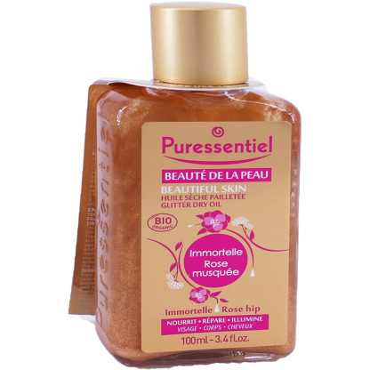 Puressentiel propose un large choix de produits d’aromathérapie et de cosmétique naturelle formulés à base d’huiles essentielles et d’actifs issus de la nature pour assurer santé et bien-être à l’organisme dans le respect son environnement. La gamme Puressentiel Beauté de la peau offre des produits formulés à base de 4 huiles essentielles précieuses et 4 huiles végétales merveilleuses pour améliorer la qualité de la peau et lutter contre tous les petits désordres cutanés. L’Huile sèche Pailletée Beauté de la peau est une huile de soin composée d’huiles essentielles d'Immortelle, de Géranium rosat, de Lavande vraie et d’Ylang Ylang associées à des huiles végétales merveilleuses de Rose Musquée, d’Amande, d’Olive et de Sésame. Cette Huile sèche offre à la peau tous les bienfaits de ces actifs naturels : hydratants, nourrissants, protecteurs, régénérants apaisants,… La peau régénérée est protégée du vieillissement cutané, de la perte d’élasticité, et nourrie. Ses nacres d’origine naturelle (sourcées de façon éco-solidaire et responasble) sublime la peau et illumine le bronzage pour longtemps. Sa texture soyeuse qui pénètre rapidement à l’application, laissera la peau douce et délicatement parfumée. Instantanément, la peau est réconfortée, et cheveux et peau sont éclatants. Pour toutes les peaux et tous les cheveux.