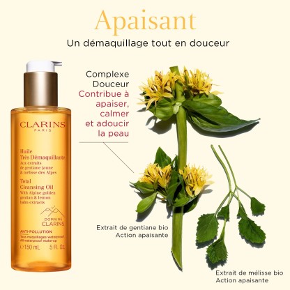 L'Huile très démaquillante de CLARINS aux extraits de Gentiane Jaune & Mélisse des Alpes, une huile spécialement conçue pour nettoyer en profondeur et en douceur le visage et les yeux, en vente dans votre parapharmacie en ligne.