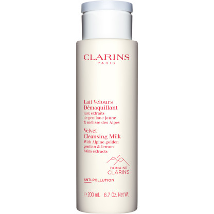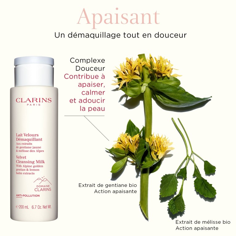Lait Velours Démaquillant de CLARINS, un démaquillant aux Extraits de Gentiane Jaune et de Mélisse des Alpes pour nettoyer le visage et préserver le microbiote cutané, en vente dans votre parapharmacie en ligne.
