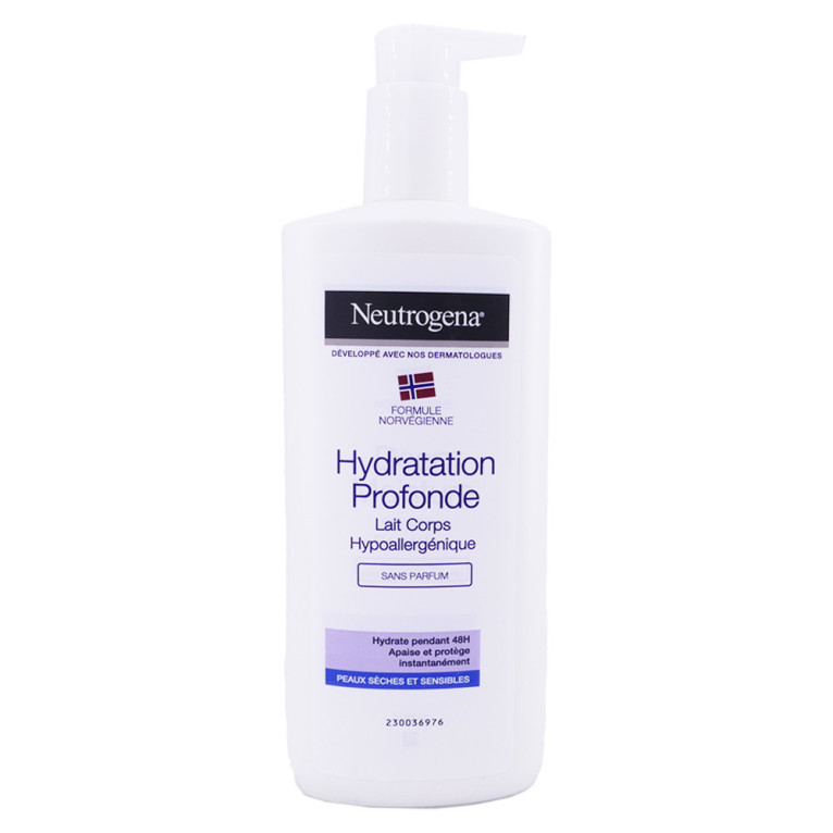 Hydratation Profonde Lait Corps discount de NEUTROGENA, le lait hydratant sans parfum pour le corps à la formule norvégienne développé par des dermatologues pour prendre soin de la peau sèche et sensible, dans votre parapharmacie en ligne à prix discount. Corps