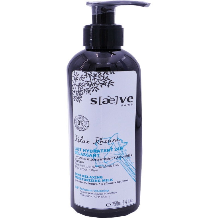 S[aè]ve est un laboratoire français spécialisé dans les produits cosmétiques naturels pour le plus grand respect de toutes les peaux. A base du brevet Immunox®, ces produits contiennent de la sève fraîche de bouleau bio aux pouvoirs antioxydydants, détoxifiant, hydratant et apaisant ainsi que de chaga bio qui est appelé aussi « champignon de l’immortalité » riche en antioxydants et ß-glucanes à forte concentration pour renforcer la peau et son ADN. La gamme [Relax Rheum] est composée de produits destinés à détendre et prendre soin du corps grâce aux vertus de l’extrait de rhubarbe aux vertus relaxantes. Le Lait Hydratant 24h Délassant est un soin ultra-doux à base de sève fraîche de bouleau bio (antioxydant, détoxifiant, hydratant, apaisant), extrait de rhubarbe (hydratant), huile d’olive (nourrissante). Il va intensément nourrir, réparer l’épiderme pour le protéger des agressions extérieures en formant un film protecteur, hydrater pendant 24 heures, et laisser sur la peau une grande douceur. Sa texture fondante non grasse et non collante, se transforme en eau au massage pour pénètrer rapidement et laisser sur le corps des notes de rhubarbe sucrée avec une pointe de thym aromatique et sauge herbacée. Dès l’application, la peau retrouve douceur, souplesse et confort, elle est lisse, tonifiée et plus ferme. Sans paraben, sans phénoxyéthanol, sans huile minérale, sans ingrédient d'origine animale, sans silicone, sans PEG, sans gluten, sans sodium laureth sulfate, sans colorants. Testé dermatologiquement.