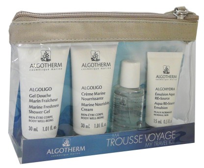 La trousse voyage ALGOTHERM, 4 produits en petit format pour prendre soin de soi en déplacement pour une hydratation et un confort à tout moment : 1 gel douche Marin Fraîcheur algoligo (30ml), 1 crème marine nourrissante Algoligo (30ml), 1 émulsion Aqua Re-Srouce Algohydra (15ml), et 1 eau micellaire Algoessential (25ml)
