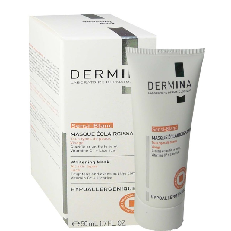 La gamme Sensi-blanc du laboratoire dermatologique DERMINA contient des produits très doux qui viennent aux besoins des peaux sensibles pour protéger, clarifier et apaiser tout en douceur, et redonner de l’éclat au teint. Le Masque éclaircissant SENSI-BLANC à base de vitamine C stabilisée (ascorbyl tetraisopalmitate) et extraits de licorice et soja, qui sont des actifs antioxydants et éclaircissants ainsi que d’huile d’avocat et extrait de kiwi, va protéger du stress oxydatif, estomper les taches brunes et petits défauts, éclaircir le visage pour retrouver un teint lumineux, nourrir et hydrater la peau intensément pour préserver l’eau en profondeur et assurer une hydratation en continu tout en l’adoucissant, et apaiser de tout inconforts. Sa texture crème riche et épaisse fera de ce soin un moment agréable. Il laisse la peau unifiée avec une grande douceur après le soin. Dès l’application, la peau est fraîche, clarifiée et douce. Jour après jour, le teint unifié retrouve sa luminosité, les taches cutanées s’estompent. Hypoallergénique. Testé sous contrôle dermatologique. Efficacité éclaircissante testées sur peaux asiatiques. Sans parfum