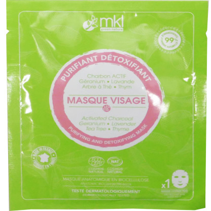 MKL Green nature propose des soins composés d’ingrédients naturels et authentiques, issus de formules ancestrales dont l’efficacité n’a jamais été remise en question, testés sur un panel de volontaires et non sur les animaux, garantis sans paraben, sans chlorhydrate d'aluminium, sans alcool et sans graisse animale. Le Masque Visage Purifiant Détoxifiant Bio, au conditionnement individuel, est destiné à éliminer toutes les impuretés sans agresser la peau, purifier, tout en apaisant de tout inconforts. Composé de charbon actif, de géranium, lavande arbre à thé et thym, il élimine les toxines et cellules mortes de l’épiderme et toutes les impuretés pour une peau parfaitement nette, resserre les pores pour réguler la quantité de sébum en absorbant l’excès afin d’affiner le grain de peau, purifie, protège des bactéries qui causent l’apparition des imperfections et inflammations, assainit, et apaise les inflammations et autres inconforts. En bio-cellulose, le masque adhère parfaitement à la forme du visage pour un soin confort. Ce masque prêt à l’emploi lisse, hydrate l’épiderme en profondeur, et apporte éclat au visage. Testé dermatologiquement