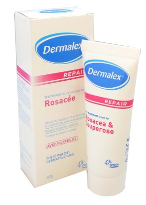 Les produits DERMALEX sont composés de soins pour traiter et soulager les peaux souffrant de sècheresse, d’eczéma et de psoriasis. La crème Repair Rosacée répare en reformant le film protecteur de l’épiderme et protège de nouvelles poussées de rosacées et couperose, estompe les rougeurs sur la peau, hydrate et apaise instantanément et pour longtemps de tout inconforts grâce au complexde Tri-Solve ainsi qu’aux pigments de couleur verte. Sa texture non grasse pénètre vite à l’application pour laisser la peau confortable et douce dès l’application.