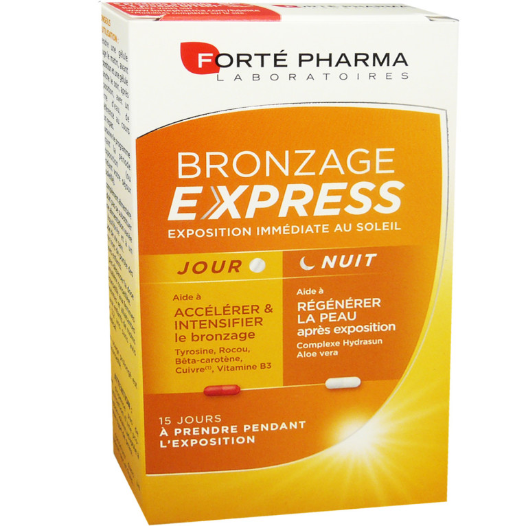 Depuis 1999, les Laboratoires FORTÉ PHARMA développent des compléments alimentaires efficaces et innovants, aux formules issues de la recherche en nutrition cellulaire, pour contribuer à renforcer les ressources vitales des utilisateurs. L’univers beauté de FORTÉ PHARMA propose des produits conçus pour améliorer la beauté de la peau, des ongles et des cheveux. Bronzage Express agit de l’intérieur le jour et la nuit, pour aider à stimuler, sublimer et prolonger le bronzage, régénérer et hydrater la peau, rapidement dès la première exposition au soleil. Sa formule exclusive contient des actifs hautement concentrés : L-Tyrosine, Rocou, Bêta-carotène, Cuivre et Vitamines B3 ainsi qu’un complexe Hydrasun (Chlorella, Ascophyllum nodosum), pour sublimer la peau.