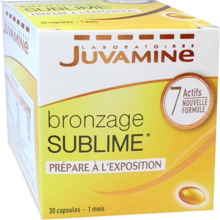 JUVAMINE Bronzage SUBLIME du laboratoire JUVAMINE à prix discount, en vente dans votre parapharmacie en ligne discount, un complément alimentaire sous forme de capsules à base de 7 actifs beauté dont l’Huile de Carthame qui participe à l’hydratation et à la beauté de la peau.