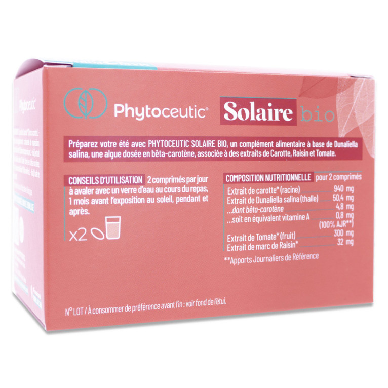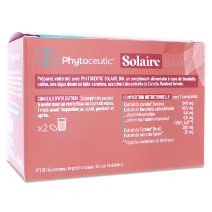 SOLAIRE BIO Teint Hâlé est un complément alimentaire sous forme de comprimés, à base d’extraits de carotte, de raisin, de tomate et de Dunaliella Salina une algue du Pacifique riche en bêta-carotène pour se préparer tout naturellement pour l’été