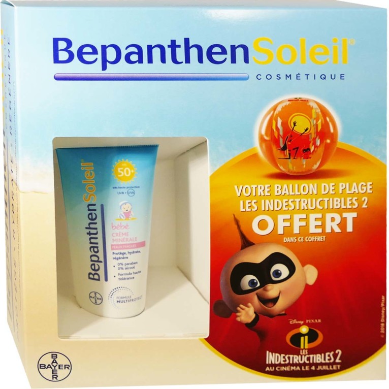 Le Coffret Soleil Bébé BEPANTHEN discount, une crème minérale bébé 50+ et un ballon dans un coffret dans votre parapharmacie en ligne à prix discount, pour profiter de la plage sans agresser la peau des tout-petits par le soleil : Crème minérale très haute protection solaire haute tolérance + Ballon gonflable « Les indestructibles » offert. Peaux sensibles et fragiles du visage et du corps.