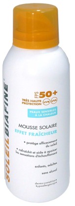La gamme Soleilbiafine du laboratoire BIAFINE propose des produits hautement efficaces pour protéger la peau de toute la famille du soleil par sa formule essentiellement composée d’un actif végétal antioxydant. La mousse solaire effet fraîcheur protège des coups de soleil, les cellules de la peau du vieillissement prématuré en luttant contre les rayons UVA/UVB à large spectre, et rafraîchit des rougeurs et échauffements, grâce au puissant anti-oxydant, à la vitamine E, ainsi qu’aux actifs Effet Fraîcheur innovante. Sa texture mousse ne laisse pas de trace blanche sur la peau, et est vite absorbée. Après l’application, la peau intensément fraîche retrouve douceur et confort. Elle résiste bien à l’eau.