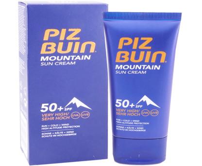 La marque PIZ BUIN propose des produits solaires performants répondant à tous les types de peaux et tous les types d’ensoleillement : montagne, mer, peau allergiques, peau grasse,… PIZ BUIN Mountain SPF50+ est une crème pour la protection du visage, lors d’exposition en haute altitude ou d’exposition extrême (vent, froid,…). Elle protège des coups de soleil causés par les rayons UVA/UVB, et préserve la peau du vieillissement prématuré ainsi que la protection des cellules de l’épiderme, et hydrate la peau grâce aux filtres solaires à large spectre UVA/UVB, au complexe "Cold Shield" (beurre de karité, tréhalose, glycérine) ainsi qu’à l’Edelweiss (ou « étoile des glaciers ») antioxydant. Sa texture riche et non grasse s’étale facilement sur la peau et est vite absorbée. La crème est résistante à l’eau et à la sueur.
