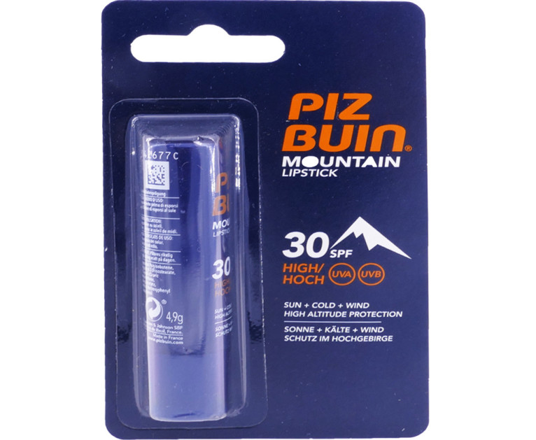 La marque PIZ BUIN propose des produits solaires performants répondant à tous les types de peaux et tous les types d’ensoleillement : montagne, mer, peau allergiques, peau grasse,… PIZ BUIN Mountain SPF30 est un stick en baume pour la protection des lèvres lors d’exposition en haute altitude ou d’exposition extrême (vent, froid,…). Il protège des coups de soleil causés par les rayons UVA/UVB, et préserve la peau du vieillissement prématuré ainsi que la protection des cellules de l’épiderme, et hydrate la peau grâce aux filtres solaires à large spectre UVA/UVB, au complexe "Cold Shield" (beurre de karité, tréhalose, glycérine) ainsi qu’à l’Edelweiss (ou « étoile des glaciers ») antioxydant. Sa texture nourrissante s’étale facilement sur les lèvres et est vite absorbée. Le soin est résistant à l’eau et à la sueur.
