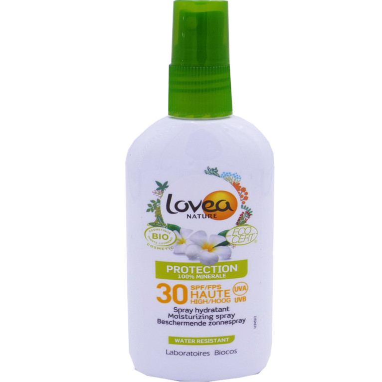 La marque LOVEA des laboratoires Biocos est composée de soins de beauté et solaires naturels et biologiques aux parfums ensoleillés, destinés à toute la famille, pour prendre soin de la peau et des cheveux et les sublimer au quotidien. Spray Solaire Haute protection SPF30 Certifié Bio LOVEA à la texture non collante, est un soin haute protection (SPF30) certifié biologique par Ecocert qui assure protection contre les UVA/UVB grâce à ses écrans minéraux micronisés pour un effet blanc limité, réparation et hydratation de la peau. La peau est délicatement parfumée, et très douce. Résistante à l’eau. Sans PABA, sans paraben, sans nanoparticule et sans produit chimique