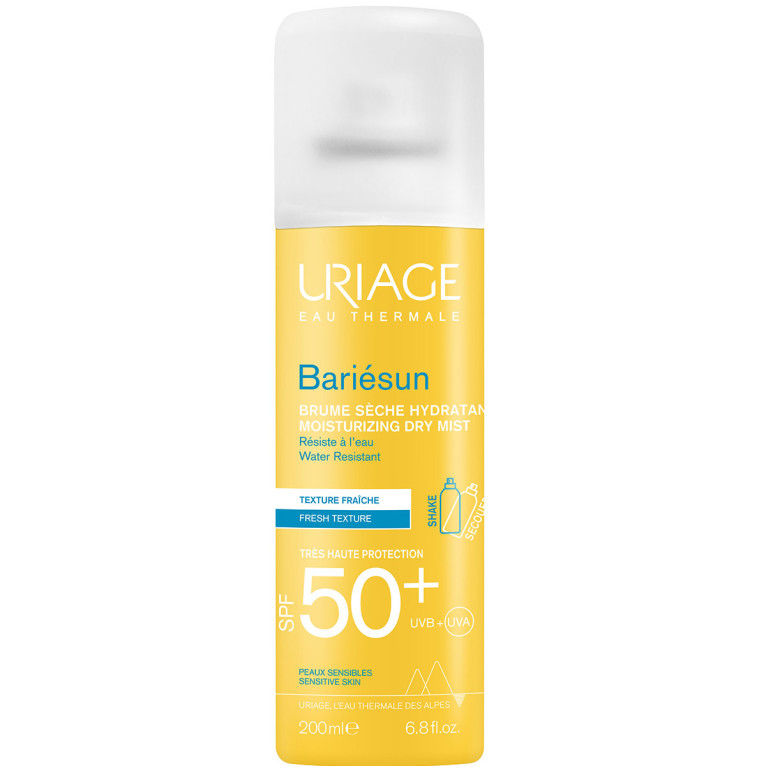 La brume sèche SPF50+ BARIESUN d’Uriage, au format aérosol pour atteindre les zones difficiles du corps, à la texture légère et invisible qui pénètre rapidement la peau sans effet collant pour un fini sec, est une brume très haute protection solaire enrichie à l’eau thermale d’Uriage ainsi qu'aux actifs d'Aquaspongines spécialement formulée pour les peaux sensibles claires. Ce soin hydratant et anti-radicalaire est composé d’un complexe de filtres solaires dernière génération, de vitamine C stabilisée et vitamine E qui assurent une haute tolérance et une sécurité maximum, et une hydratation intense pour préserver la peau du dessèchement. Résistant à l’eau et à la sueur, hypoallergénique et sans alcool.