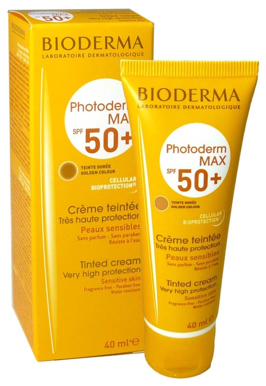 Les produits Photoderm de BIODERMA sont des produits protecteurs de la peau des rayons du soleil et autobronzants adaptés à toute la famille avec différents indices de protection par sa formule essentiellement composée d’un brevet exclusif bioderma Bioprotection® cellulaire. Photoderm Max 50+ Crème teintée est la photoprotection spécifique de la peau très claire sensible ou intolérante au soleil avec taches de rousseur et/ou exposées à un ensoleillement maximum. Son système filtrant anti-UVA et anti-UVB, et le complexe exclusif Bioprotection Cellulaire protège des intolérances solaires ainsi que du vieillissement prématuré des cellules. Sa texture crème non grasse, incolore ne laisse pas de traces blanches et fond sur la peau pour une pénétration rapide à l’application. Matifiée, toutes les petites imperfections sur la peau seront estompées. Sa teinte dorée laisse un joli hâle pour un teint unifié. Hypoallergénique. Non comédogène. Photostable. Excellente tolérance