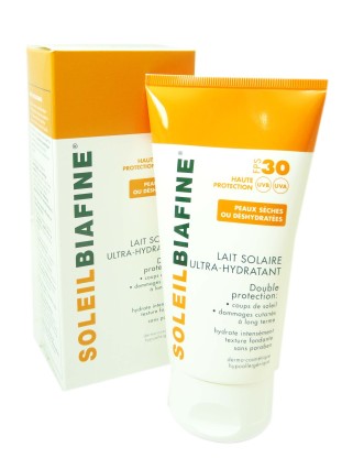 SOLEILBIAFINE lait solaire ultra-hydratant SPF30, l’expertise BIAFINE pour assurer une haute protection solaire aux peaux sèches et déshydratées.