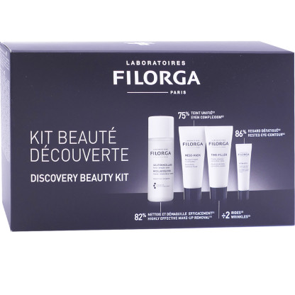 FILORGA KIT DECOUVERTE 4 SOINS discount des Laboratoires FILORGA, un kit pour prendre soin du visage, des yeux et des lèvres dans votre parapharmacie en ligne à prix pas discount. Ce Kit contient : Filorga Solution Micellaire Anti-Âge (50 ml), Filorga MESO-MASK Masque Lissant Illuminateur (15 ml), Filorga TIME-FILLER (15 ml), Filorga OPTIM-EYES Contour des Yeux (4 ml)