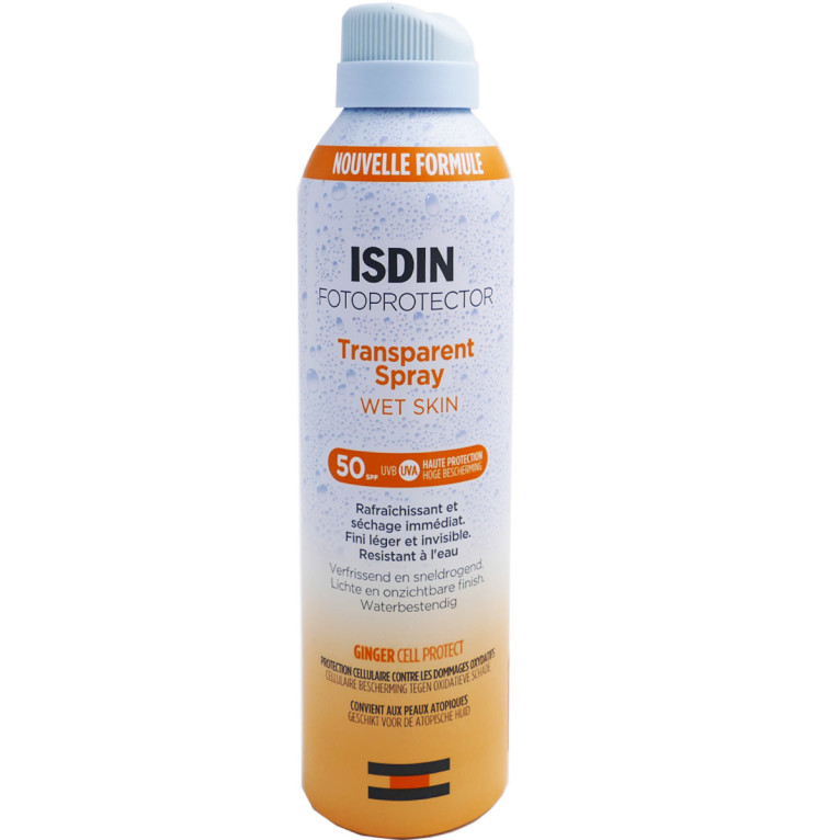 Fotoprotector Transparent Spray Wet Skin SPF50+ du laboratoire ISDIN discount, une très haute protection dans votre parapharmacie en ligne à prix discount, qui protège très efficacement (SPF50+) les peaux normales, mixtes et grasses du soleil même mouillées.
