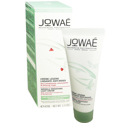 La marque JOWAE inspirée des rituels des femmes coréennes se compose de produits cosmétiques phytoactifs issus de la recherche franco-coréenne à base de lumiphénols et ingrédients naturels pour prendre soin de la peau de toutes les femmes et révéler beauté et confort. La gamme Anti-rides permet grâce aux pouvoirs du Ginseng Rouge de retrouver jeunesse et éclat, et redonner au visage sa luminosité. La Crème légère lissante anti-rides est un soin à base de Lumiphénols (riche en antioxydant) et de Ginseng Rouge, associé à un peptide lissant, de la vitamine E, de l’acide hyaluronique, et de la glycérine végétale. Elle va protéger la peau des agressions extérieures (pollution, changement de température,…) en formant un film protecteur et laisser une grande douceur, estomper et lutter contre les rides et ridules du visage, et intensément hydrater la peau. Dès l’application, la peau retrouve douceur, souplesse et confort, elle est visiblement plus lisse. Le visage retrouve son éclat, sa fermeté et sa jeunesse. Testé sous contrôle dermatologique. Sans paraben, sans phénoxyéthanol, sans huile minérale, sans ingrédient d'origine animale*, sans silicone**, sans colorant de synthèse