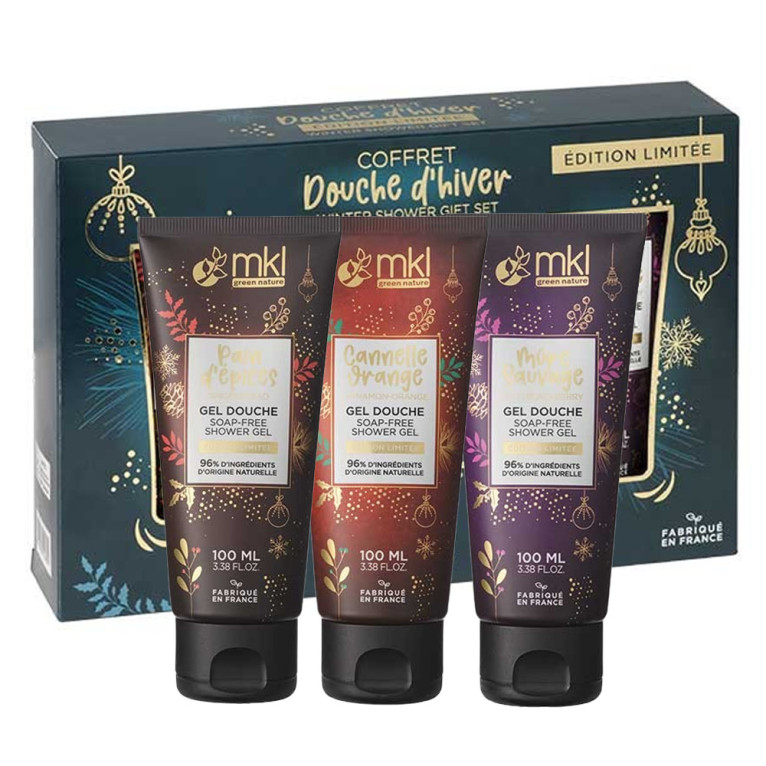 Le laboratoire MKL a créé ce coffret pour offrir une expérience de douche unique et agréable. Les trois gels douche aux parfums d'hiver (orange cannelle, mûre et pain d'épice) sont formulés avec des ingrédients naturels et respectueux de la peau. Leurs formules vont nourrir et hydrater la peau, apaiser et adoucir.