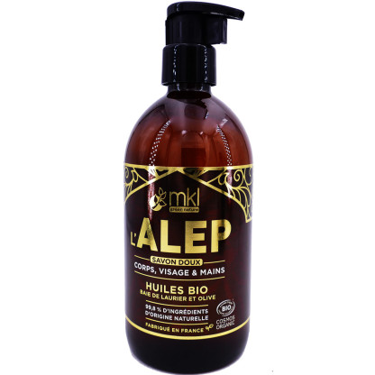 Le savon L’Alep doux de MKL green nature Certifié Bio associe la tradition ancestrale des savons fabriqués au chaudron à Alep en Syrie, aux exigences des normes européennes de la dermo-cosmétique pour offrir un savon liquide d’une grande douceur pour les épidermes sensibles. Composé d’huile de baies de laurier noble et d’huile d’olive bios associé à du gel d’aloe vera bio, ce savon liquide lave en douceur, hydrate, rétablit le film hydrolipidique et adoucit les peaux fragilisées. Son utilisation convient particulièrement aux peaux soumises à de petits désordres cutanés : irritations, rougeurs, squames… et aux cheveux comme shampooing lors de pellicules, démangeaisons, etc.