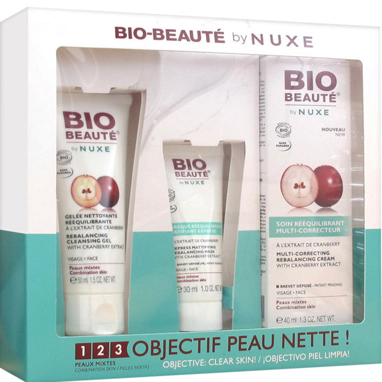 Le coffret « Peau nette » Bio Beauté de NUXE discount, 3 produits fraîcheurs dans votre parapharmacie en ligne à prix discount, réunis pour nettoyer, matifier et rafraichir les peaux mixtes du visage : Gelée Nettoyante Réequilibrante (50ml) ; Masque Rééquilibrant Matifiant Express (30 ml) ; Soin Réequilibrant Multi-Correcteur (40 ml).