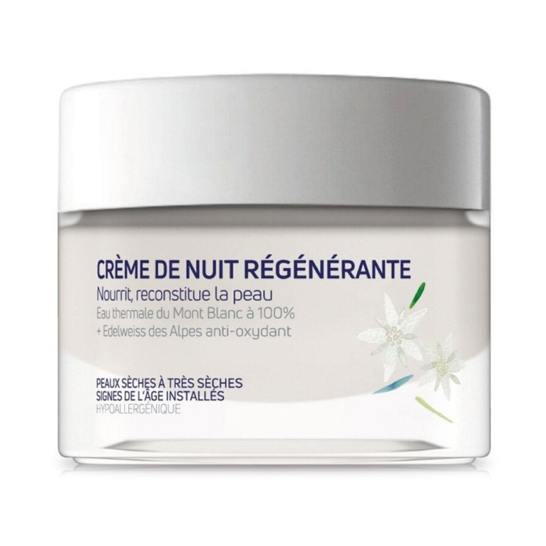 Le laboratoire SAINT-GERVAIS développe des produits dermo-cosmétiques élaborés avec de l’eau thermale de SAINT-GERVAIS Mont Blanc du massif alpin riche en minéraux aux propriétés réparatrices apaisantes, et cicatrisantes, pour répondre à tous les besoins des peaux même les plus fragiles. La Crème de Nuit Régénérante est un soin anti-âge spécialement formulé pour régénérer la peau et la reconstituer, protéger et nourrir les peaux sèches à très sèches des femmes dès 45 ans pendant le sommeil. Sa formule associe de l’eau thermale pure Mont Blanc (100%), un extrait d’Edelweiss des Alpes (issu du commerce équitable), de la glycérine hydratante, et un extrait actif de lin alpin apaisant. L’ADN des cellules de la peau est protégé de l’apparition des signes de l’âge et des agressions extérieures (soleil, pollution,…), il se régénère pendant toute la nuit, la peau est intensément nourrie et apaisée. Sa texture fond instantanément sur la peau pour la laisser douce avec un parfum frais des alpes. Elle retrouve sa jeunesse, son éclat, sa souplesse, et sa douceur le lendemain. Testé sous contrôle dermatologique, hypoallergénique, sans paraben, et sans phénoxyéthanol.