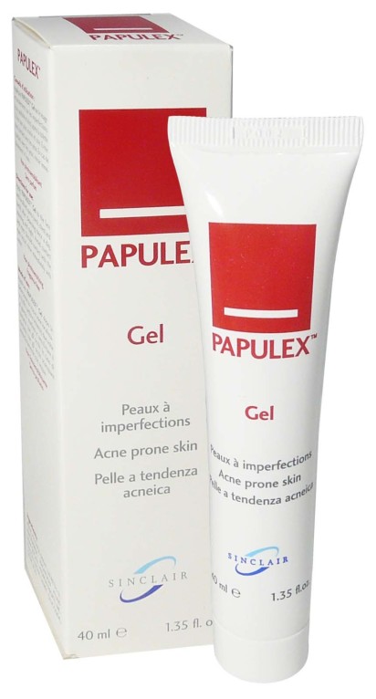 PAPULEX Gel des laboratoires SINCLAIR, le soin qui élimine les imperfections des peaux à tendance acnéique du dos, du torse, et du visage.