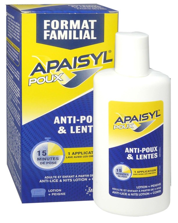 Apaisyl Poux en format familial, le shampooing qui lutte contre la prolifération des poux et les tue tout en nettoyant les cheveux. A partir de 2 ans.