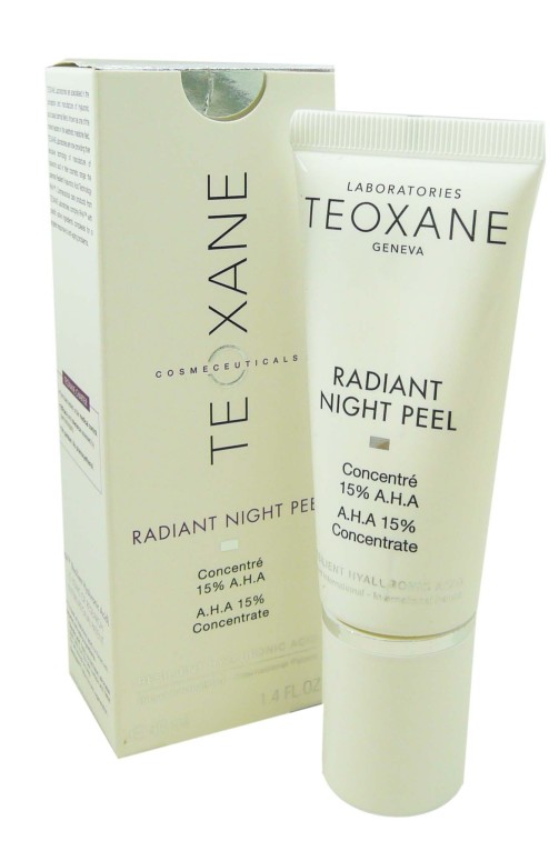 TOXEANE offre son expertise dans le domaine de la médecine esthétique à travers une gamme de soins anti-âge de comblement formulés à partir d’une technologie unique brevetée « RHA : RESILIENT HYALURONIC ACID » qui assure un résultat spectaculaire sur tous les problèmes liés au vieillissement cutané. RADIANT NIGHT PEEL de TEOXANE permet de transformer visiblement la qualité de la peau et réduire les rides, grâce à sa concentration en RHA qui stimule les processus naturel de synthèse d’acide hyaluronique, de collagène et renforce les tissus de soutien, combinée à de l’acide glycolique dosé à 15 %. La texture de la peau s’améliore visiblement, les imperfections pigmentaires sont réduites, les rides sont lissées.