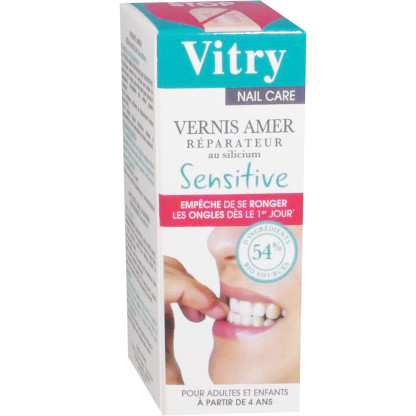 Le laboratoire VITRY conçoit des produits cosmétiques brevetés pour le soin des mains et des pieds, le maquillage des yeux, et des accessoires de manucure. Grâce à l'amertume de sa formule qui résiste à l'eau et stoppe l'envie de se ronger les ongles et les cuticules, NAIL CARE VERNIS AMER SENSITIVE de Vitry vous donne les pouvoir de dire STOP aux ongles rongés et abîmés. Cette mauvaise habitude peut provoquer des microlésions cutanées pouvant entrainer des infections locales. La formule exclusive de ce vernis amer est enrichie en ingrédients biosourcés (54%) et en silicium, aide à réparer, protéger et fortifier les ongles rongés et abimés. Autorisé pour les enfants à partir de 3 ans, NAIL CARE VERNIS AMER SENSITIVE de Vitry empêche de sucer son pouce.