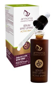La marque ARMONIA des laboratoires PHYTOCEUTIC est composée de produits cosmétiques hydratants, nourrissants, réparateurs à base d’ingrédients naturels dont l’extrait de bave d’escargot, pour le plus grand respect de la peau et révéler toute sa beauté. Le sérum effet lifting Active Snake composée d’un tripeptide ingrédient dernière génération SYN-AKE, ainsi que d'acide hyaluronique, vitamine E, collagène hydrolysé, huile de rosier muscat et extrait d'aloe vera biologique, va lisser la peau par un effet lifting intense afin de diminuer la taille des rides d’expressions, et protéger la peau du vieillissement prématuré en luttant contre l’apparition des signes de l’âge (rides et ridules). La peau retrouve de l’éclat et une seconde jeunesse.