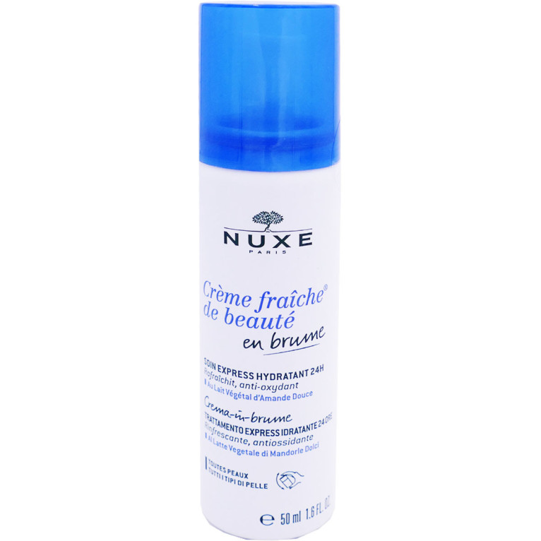 Nuxe, contraction de Nature et Luxe, développe depuis 25 ans des soins cosmétiques raffinés, élaborés avec des actifs végétaux précieux, sans huile minérale ni matière animale hormis les produits de la ruche, pour offrir des produits associant avec le plus bel équilibre : nature, performance et sensualité. La gamme Crème fraîche de Beauté propose des soins au lait végétal pour assurer une hydratation intense pendant 24 heures aux peaux assoiffées. Crème fraîche de beauté en Brume efficace comme une crème hydratante et légère comme une brume, formulée avec 89% d’ingrédients d’origine naturelle dont du lait végétal et un extrait d’Algue rouge issu d’une technologie verte High-tech ainsi que de vitamine E, est spécialement conçu pour protéger la peau des agressions quotidiennes et de la pollution hydrater intensément et maintenir un taux d’hydratation optimal pendant 24 heures en captant l’eau dans la peau. Aérienne la brume laisse la peau fraîche dès l’application et l’enveloppe d’un délicat parfum de fleurs d’oranger et de cèdre. La peau est douce et retrouve son confort. Hypoallergénique. Certifié vegan sans ingrédients ni dérivés d'origine animale