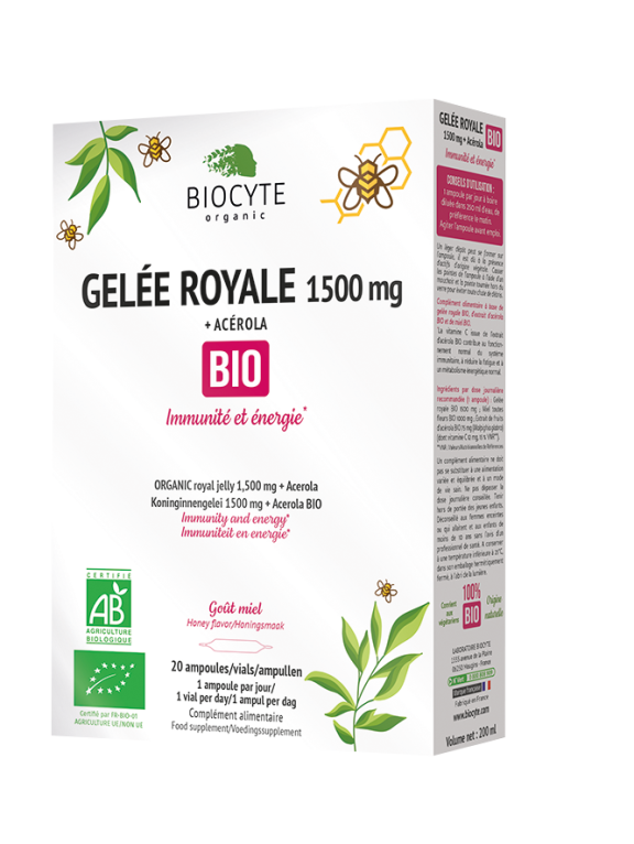 Complément alimentaire à base de gelée royale bio, d'acérola bio et vitamine C. Sans colorants, sans conservateur ni édulcorants