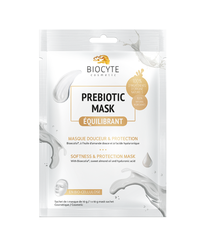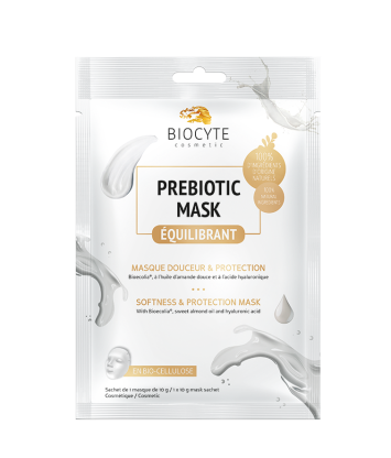 Biocyte a bâti ses fondations en étant précurseur d'une nouvelle discipline : LA NUTRICOSMETIQUE. Elle est l'évolution naturelle de la cosmétique, son action étant plus profonde, plus globale et plus durable. Le Masque Prebiotic Mask au conditionnement individuel, est enrichi en actifs protecteurs et hydratants à effet anti-rougeurs et rééquilibrant immédiat. A base de prébiotiques, il va rééquilibrer la flore cutanée, la protéger de la déshydratation, et diminuer les rougeurs, immédiatement. L’huile d’amande douce et l’acide hyaluronique hautement hydratants vont adoucir et repulper la peau. En fibres naturelles de bio-cellulose, le masque adhère parfaitement à la forme du visage pour un effet « seconde peau » qui est 10 fois supérieure aux masques conventionnels.