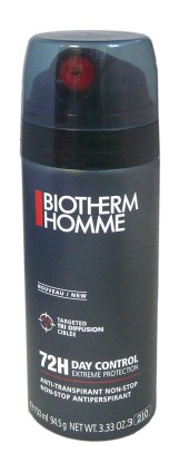 La gamme Homme Day Control des laboratoires BIOTHERM est composée de déodorants anti-transpirants pour des aisselles saines même les plus sensibles. Le déodorant Day control Homme Extrême protection élimine les bactéries et lutte contre leur formation, resserre les pores de la peau sans obstruer le système naturel de transpiration tout en la régulant, et apaise de tout inconfort (irritations, rougeurs), grâce à l’extrait de camomille aux propriétés apaisantes et aux microbilles de silice. Le déodorant sèche très vite pour s'habiller rapidement et ne pas laisser de traces sur les vêtements. La peau des aisselles est douce, satinée et apaisée pendant 72 heures