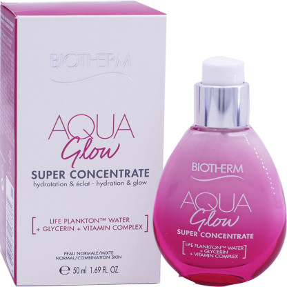 La gamme AQUA SUPER CONCENTRATE des laboratoires BIOTHERM est composée de soins super-hydratants pour les peaux déshydratées en manque d’éclat pour retrouver confort et souplesse par sa formule à base d’une forte concentration en Plancton de Vie hautement hydratant. AQUA GLOW SUPER CONCENTRATE est un gel-crème qui hydrate intensément et en profondeur pour préserver l’eau dans les cellules pour une hydratation en continu, renforce la barrière cutanée, estompe les irrégularités du teint, et redonne de l’éclat à la peau grâce au Plancton de Vie™ ultra-concentré (qui vient des sources thermales des Pyrénées françaises), riche de 35 nutriments, et à sa richesse en vitamine C. Sa texture fluide fond sur la peau pour une pénétration rapide, et laisse la peau fraîche, éclatante, et douce. Instantanément la peau est intensément hydratée pendant 24 heures pour retrouver tout son confort. Jour après jour le teint est éclatant, la peau est lumineuse.