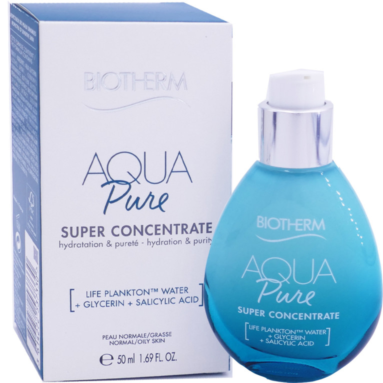 La gamme AQUA SUPER CONCENTRATE des laboratoires BIOTHERM est composée de soins super-hydratants pour les peaux déshydratées en manque d’éclat pour retrouver confort et souplesse par sa formule à base d’une forte concentration en Plancton de Vie hautement hydratant. AQUA PURE SUPER CONCENTRATE est un gel qui hydrate intensément et en profondeur pour préserver l’eau dans les cellules pour une hydratation en continu, renforce la barrière cutanée, resserre les pores de l’épiderme pour lisser le grain de peau et éliminer l’excès de sébum, et redonne de la pureté à la peau grâce au Plancton de Vie™ ultra-concentré (qui vient des sources thermales des Pyrénées françaises), riche de 35 nutriments, et à sa richesse en acide salicylique. Sa texture fluide fond sur la peau pour une pénétration rapide, et laisse la peau fraîche, matifiée, et douce. Instantanément la peau est intensément hydratée pendant 24 heures pour retrouver tout son confort. Jour après jour le teint est matifié, la peau est nette.