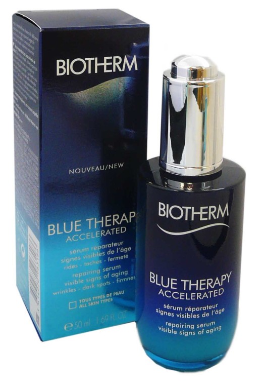 La gamme Blue therapy des laboratoires BIOTHERM est composée de soins anti-âge pour lutter contre les taches cutanées et les rides par sa formule composée essentiellement d’extraits actifs aquatiques. Le sérum Blue therapy Accelerated répare, raffermit et estompe rides, ridules et taches cutanées grâce à une nouvelle formule composée d’une algue de Jeunesse (Alaria Esculenta) qui vient des eaux glacées du Groenland composé de fibres élastiques, protéines et polysaccharides. Sa texture gel transparent léger laisse la peau fraîche et sublime par ses reflets nacrés. Dès l’application, la peau est douce et retrouve toute sa lumière. Les rides et ridules s’estompent en 1 mois pour laisser la peau éclatante et jeune.