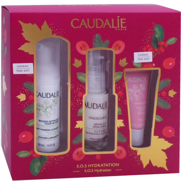 Le Coffret « S.O.S Hydratation » discount de CAUDALIE, 3 soins ultra-hydratant et réconfort dans votre parapharmacie en ligne à prix discount, pour retrouver une peau ressourcée et très douce ! Vinosource Crème Sorbet Hydratante (15ml) ; Mousse Nettoyante Fleur de Vigne (50ml) ; Vinosource Sérum SOS Désaltérant (30ml). Pour peaux sèches et sensibles