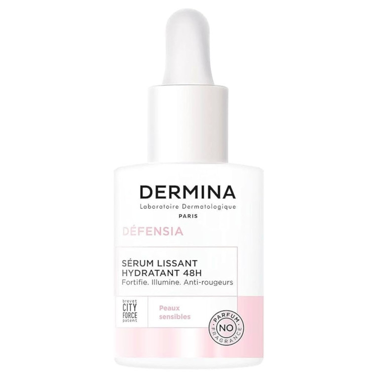 La gamme Defensia du laboratoire dermatologique DERMINA contient des produits très doux concentrés en brevet CITYFORCE qui viennent aux besoins des peaux fragilisées par la vie urbaine quotidienne pour protéger, fortifier, et redonner de l’éclat au teint. Le Sérum Lissant Hydratant 48H DEFENSIA à base du brevet CITYFORCE antioxydant, réparateur et apaisant, va protéger des agressions quotidiennes (pollution, tabac, poussière,…), réparer la barrière cutanée pour mieux se défendre en 24 heures, hydrater la peau intensément pour préserver l’eau en profondeur et assurer une hydratation en continu tout en l’adoucissant pendant 48 heures, lisser la peau pour la défatiguer, et apaiser de tout inconforts. Sa texture fluide et légère non grasse et non collante, fond dès l’application, et laisse la peau unifiée avec une grande douceur après le soin. Le teint retrouve sa luminosité, les marques de fatigue s’estompent, la peau retrouve éclat et jeunesse. Hypoallergénique. Sans parfum ajouté. Tolérance testée sous contrôle dermatologique.
