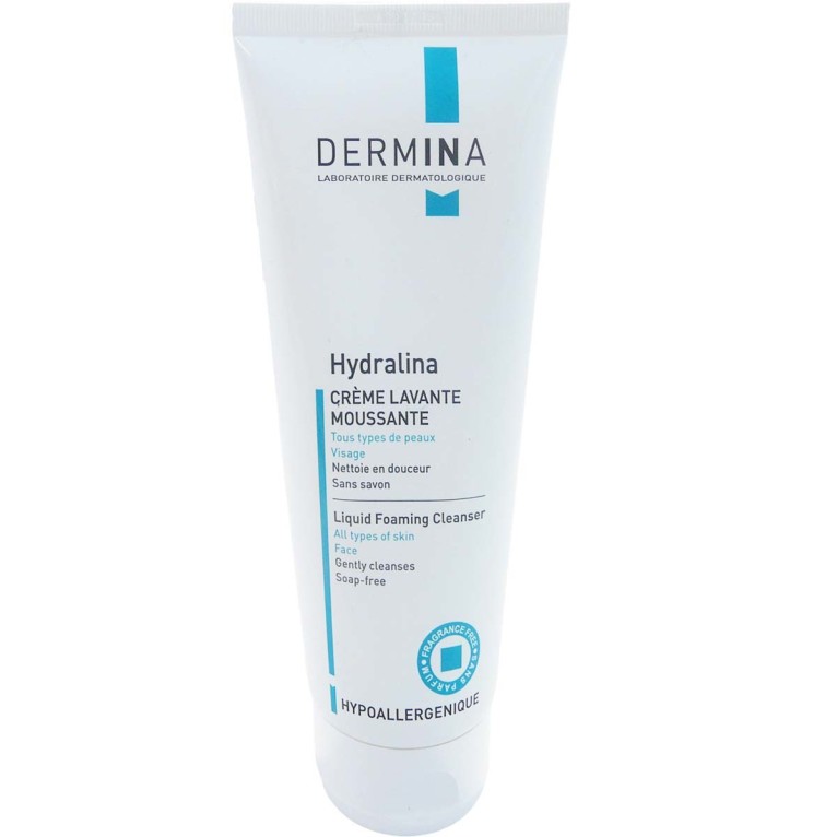 La gamme Hydralina du laboratoire dermatologique DERMINA contient des produits très doux qui viennent aux besoins des peaux sensibles pour protéger et renforcer la peau pour mieux se défendre des agressions quotidiennes, hydrater et apaiser tout en douceur, et redonner de la douceur et du confort. La crème lavante moussante HYDRALINA sans savon, est à base d’actifs hautement hydratants, anti-irritants, nourrissant et adoucissants (allantoïne, sodium PCA, glycérine) pour nettoyer délicatement la peau en éliminant toutes les impuretés, le maquillage tout en respectant son équilibre, nourrir et hydrater intensément la peau, et l’adoucir, dès l’application. Sa texture onctueuse et douce laisse sur la peau une grande douceur et un grand confort après le soin. Dès l’application et pour longtemps, la peau est nette, hydratée et douce. Hypoallergénique.